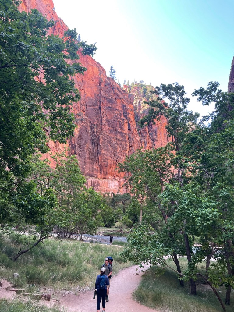 The Riverside Walk is rated as an easy trail. We would say very easy. It’s just a 2-mile roundtrip casual walk on a paved path beside the river. We were in the shade the whole walk and were actually kinda chilly! I was surprised at how many people were continuing the hike into the water on The Narrows trail, but I know it would be an amazing hike if you plan ahead and have all the gear😊 It takes a few hours to complete, and you have to be aware of deadly flash flooding that can occur😳