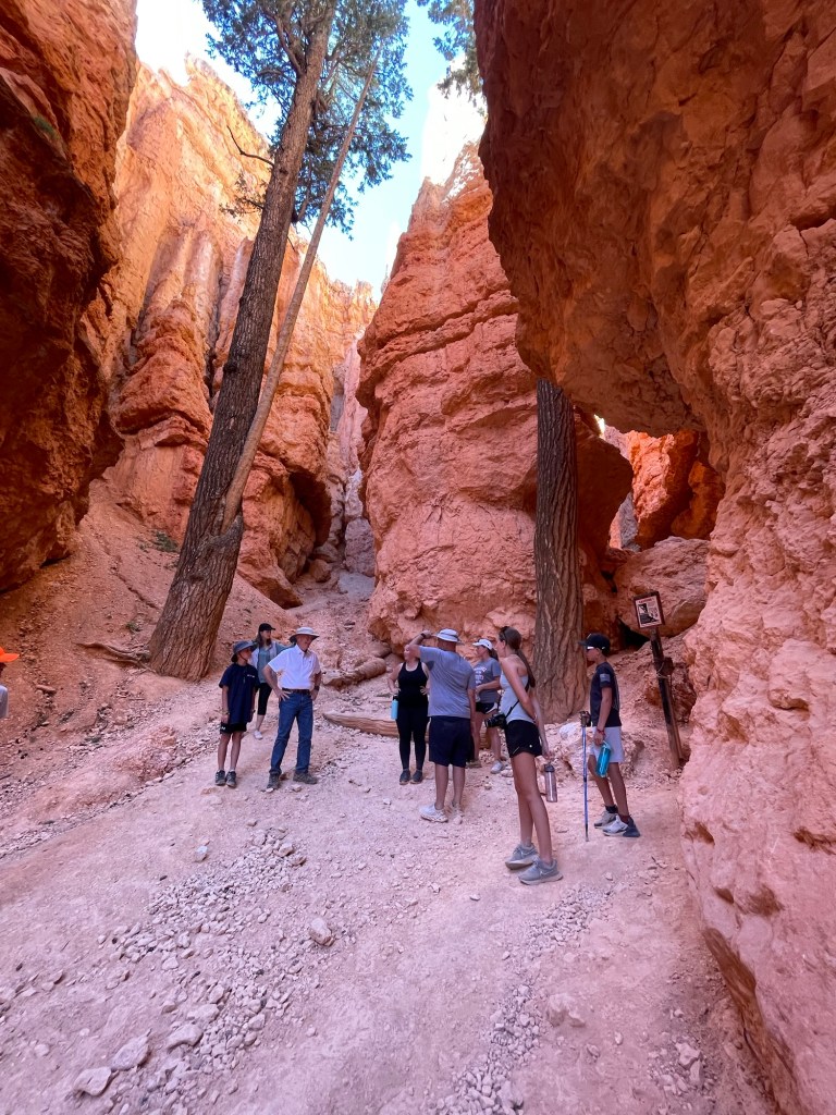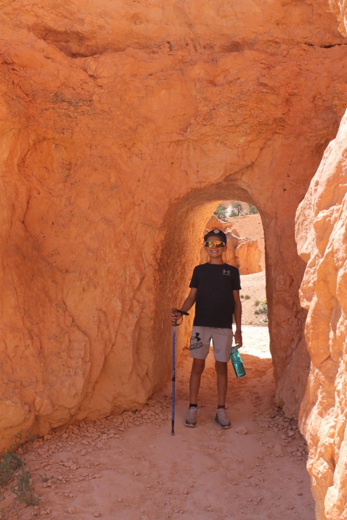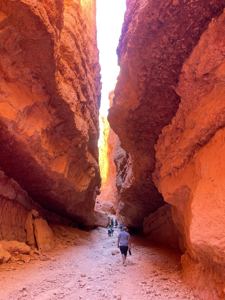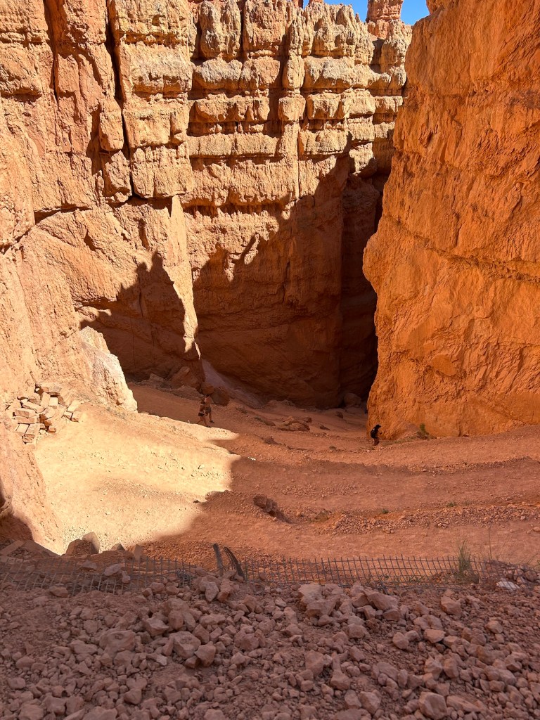 The main hike we wanted to do in Bryce Canyon NP was the Queen’s Garden/Navajo Loop hike. We started at Sunrise Point, walked to Sunset Point on the Rim Trail, and descended into the canyon on the Queens Garden Trail. We ascended on the Navajo Loop via Wall Street. Whew, what a hike!😰 It was the toughest one we did all week. It is a must-do because it is amazing to see the hoodoos and the Douglas Fir trees from the canyon floor, but the ending will have you huffing & puffing! And make sure you take lots of water with you! It’s 2.9 miles total, and it’s a dusty/dirty trail. We had dirt all over the back of our legs & in our socks & shoes. Here’s a link with good info about this hike: