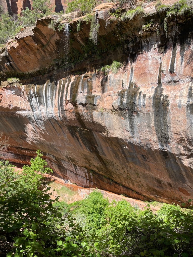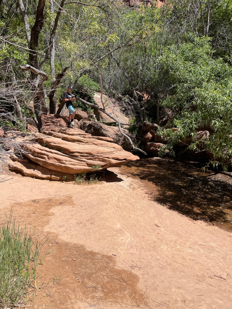 Next, we did the Middle Emerald Pools trail. Let’s just say we found the sun! After being in the shade all morning, this was completely different! Don’t forget to take water with you on this hike (or any hike). It was rated as moderate and we would agree. It’s probably more on the moderate/strenuous side. It had several places that were uphill. During our time at Zion, the bridge at shuttle stop #5 was closed, so we got off the shuttle at stop #6 and started the trail there, via Kayenta Trail. This made the hike a little longer – right at 2 miles total.