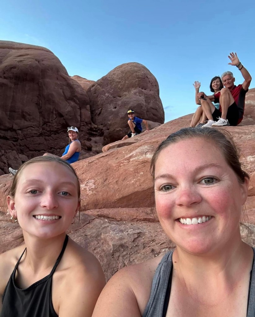 Our hummer tour was at 1:00 with Moab Adventure Center and let me tell you – it was an adventure! Everyone enjoyed it, but I was scared the first half of the trip! It is a wild, off-road ride over rocks (many of them steep😩) and it made me so nervous 😂 We made one stop & got out of the hummer. It was 400 ft above the Colorado River, and we got some awesome photos. I was much better on the second half of the trip because I knew what to expect but whew! I was kinda ready for this adventure to be over😅 We definitely saw parts of Moab we would not have seen otherwise!