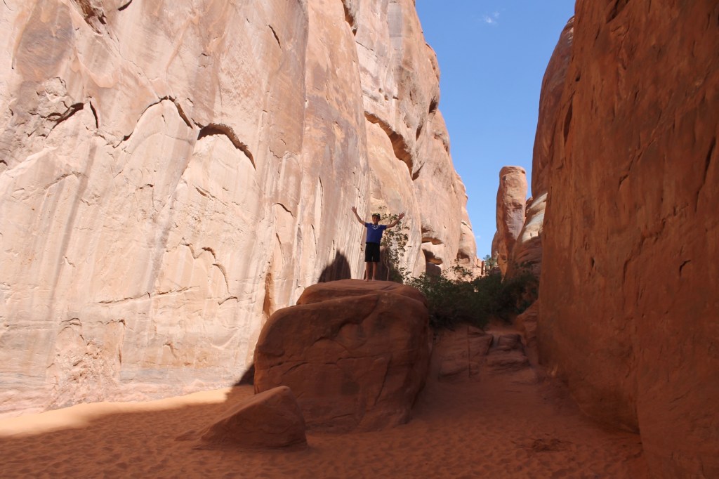 *Sand Dune Arch – 0.3 mi roundtrip – this is a must-do! Kids love this stop! There’s a lot of sand, and most kids take their shoes off to play in it. The arch was pretty, but the whole area was just really neat because it was shaded & felt about 15° cooler than it did outside that day because there are tall rocks that shade you from the sun. We were there around 4 pm.
